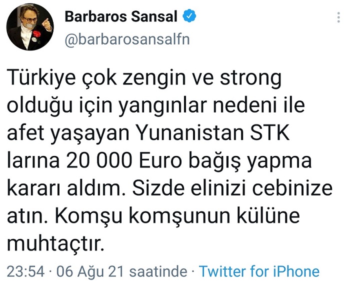 «Αφού η Τουρκία είναι πολύ πλούσια και ισχυρή, αποφάσισα να δωρίσω 20.000 ευρώ σε ΜΚΟ της Ελλάδας λόγω των πυρκαγιών», έγραψε ο Τούρκος σχεδιαστής μόδας Μπαρμπαρός Σανσάλ σε μία ανάρτησή του στο Twitter, θέλοντάς να σατιρίσει τη ρητορική Ερντογάν περί «ισχυρής Τουρκίας», την ώρα που στη γειτονική χώρα μαίνονται δεκάδες φωτιές.
