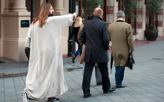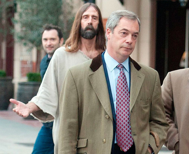 Στις φωτογραφίες που βλέπετε παρακάτω, είναι άξιος προσοχής ένας άντρας που φορά μακρύ χιτώνιο και έχει γενειάδα και μακριά μαλλιά. Όπως αναφέρουν τα διεθνή μίντια, ο συγκεκριμένος άντρας, ντυμένος ως Ιησούς Χριστός, ακολουθεί τον Φαράζ κατά πόδας.