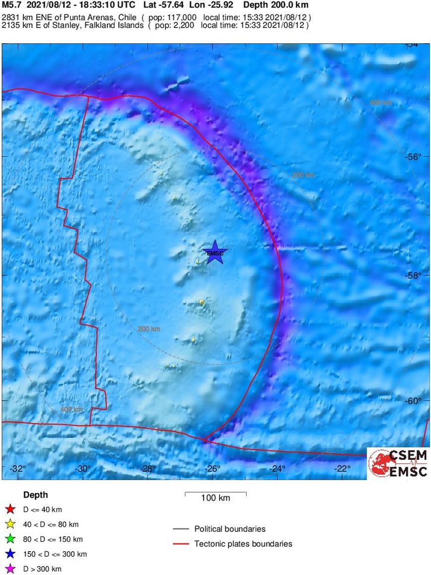 Ισχυρός σεισμός μεγέθους 7,5 βαθμών της κλίμακας Ρίχτερ σημειώθηκε στα νησιά Νότιες Σάντουιτς στις 21:33 όπως ανακοίνωσε το Ευρωπαϊκό-Μεσογειακό Σεισμολογικό Κέντρο.