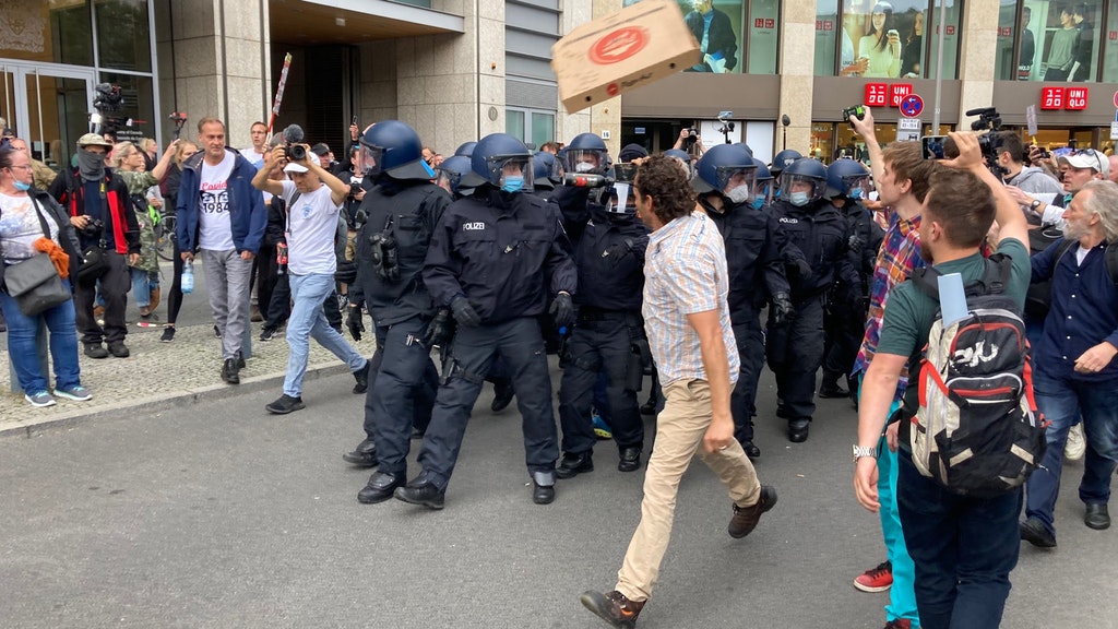Αστυνομικοί συγκρούστηκαν με διαδηλωτές σήμερα στο Βερολίνο, όπου χιλιάδες άνθρωποι πραγματοποίησαν πορεία, φωνάζοντας συνθήματα και κρατώντας πανό κατά των περιορισμών που συνδέονται με την πανδημία της Covid-19.