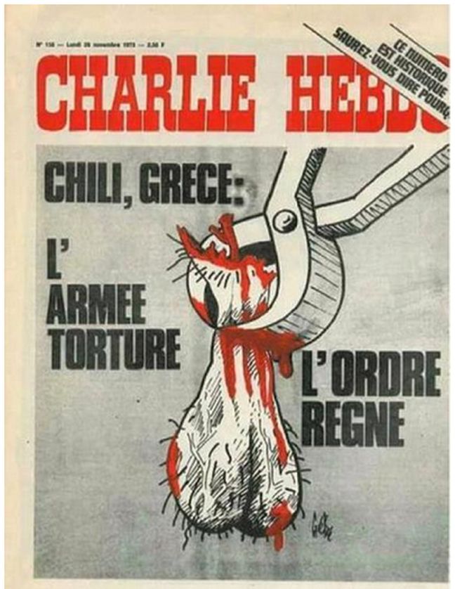 Αφιερωμένο στην Ελλάδα και τη Χιλή και συγκεκριμένα στα βασανιστήρια και τις πολιτικές εξελίξεις στις δύο χώρες με στρατιωτικό καθεστώς ήταν το πρωτοσέλιδο της Charlie Hebdo την 26η Νοεμβρίου του 1973, μία εβδομάδα μετά την εξέγερση του Πολυτεχνείου στην Αθήνα και λίγους μήνες μετά τη δολοφονία του Σαλβαδόρ Αλιέντε στη Χιλή.