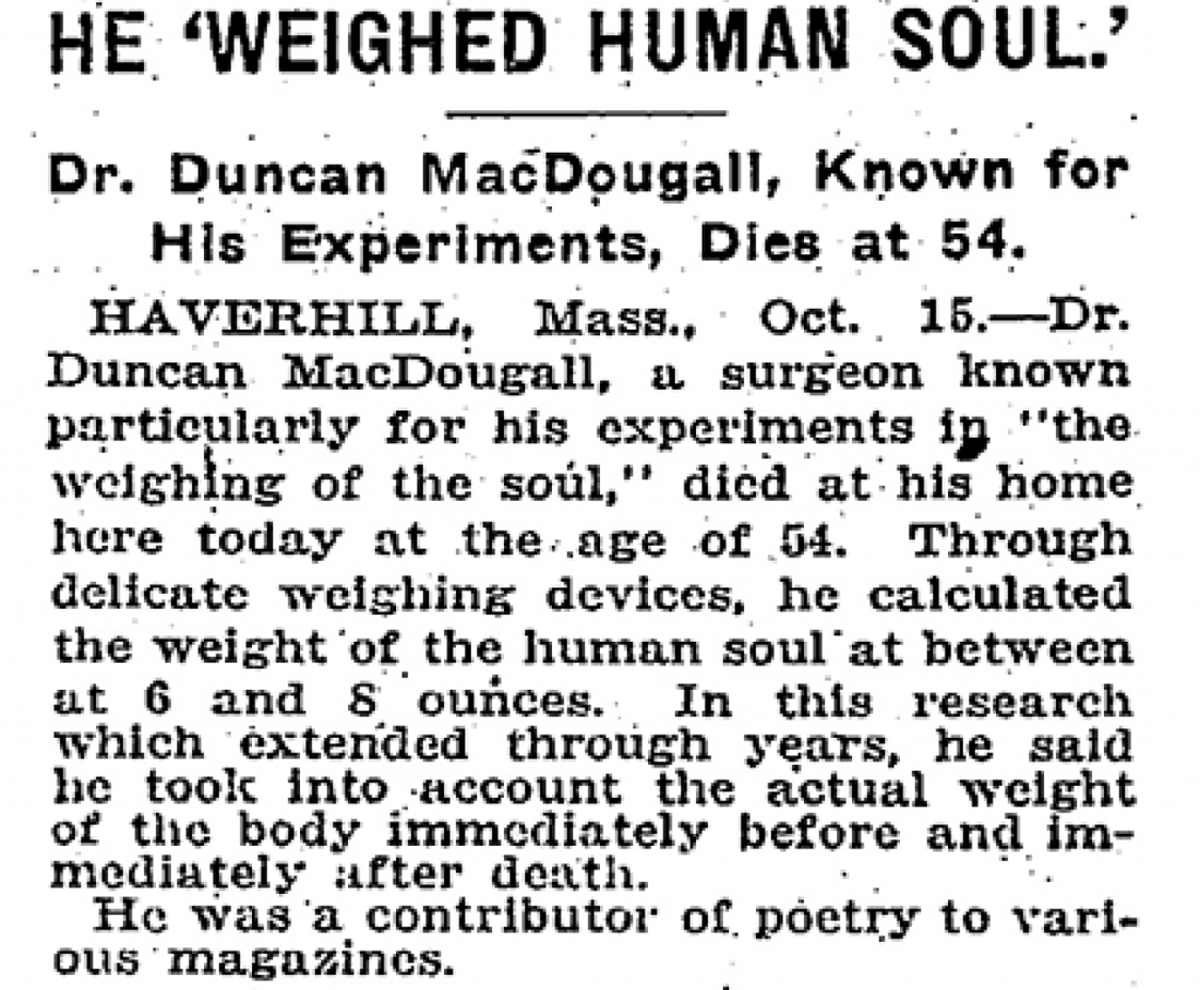 Το μακρινό 1901, ο Ντάνκαν Μακ Ντούγκαλ ήταν ένας 35χρονος γιατρός από τη Μασαχουσέτη, ο οποίος πίστευε ακράδαντα ότι η ανθρώπινη ψυχή υπάρχει και όχι απλά υπάρχει αλλά έχει και μάζα η οποία, μάλιστα, μπορεί να μετρηθεί αλλά και να… φωτογραφηθεί! Δεν ήταν, όμως, ορατή από το ανθρώπινο μάτι όπως τα υπόλοιπα όργανα, και δεν αρκούσε μία εγχείρηση για να την δει κάποιος. Ήταν κάτι σαν φως όπως αυτό του αστρικού αιθέρα!