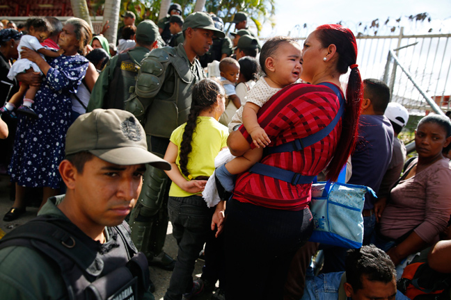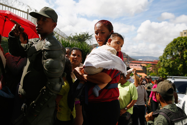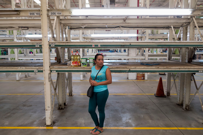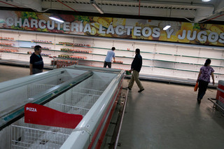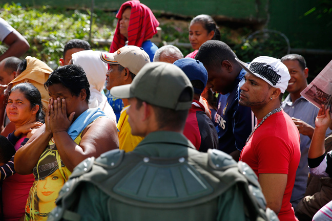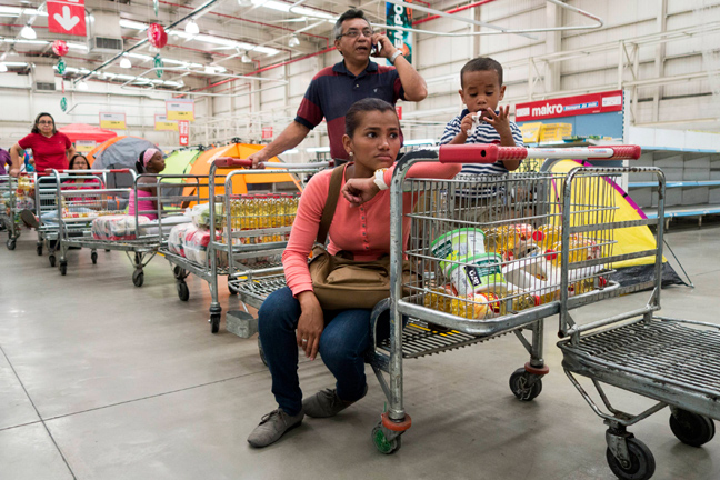Στρατιώτες φρουρούν σούπερ μάρκετ και παντοπωλεία στο Καράκας ώστε να αποφευχθεί ενδεχόμενο πλιάτσικο και επεισόδια μεταξύ των Λατινοαμερικάνων, που έχουν στην κυριολεξία αδειάσει τα ράφια των καταστημάτων.