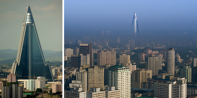 Ήταν το 1987 όταν άρχισε να χτίζεται το πολυώροφο κτίσμα της βορειοκορεατικής πρωτεύουσας, που με τους 105 ορόφους του είχε βαλθεί να γίνει το ψηλότερο ξενοδοχείο του κόσμου. Το ψηλότερο ξενοδοχείο του κόσμου δηλαδή που θα είχε όχι λιγότερα από 3.000 δωμάτια σε μια χώρα που φημίζεται για τον ελάχιστο τουρισμό της! Καταλαβαίνετε πού πάει το πράγμα. Μακράν το πιο φιλόδοξο πλάνο της απολυταρχικής βορειοκορεατικής διακυβέρνησης (και το πιο τρελό;), ήταν τόσο ακριβό που δεν μπορούσε καν να ολοκληρωθεί, ενώ μετά την κατάρρευση της Σοβιετικής Ένωσης και το απρόοπτο τέλος της εισροής «κόκκινων» κεφαλαίων στη Βόρεια Κορέα, η ανέγερση αναγκάστηκε να σταματήσει (1992). Μέχρι τότε βέβαια είχε ήδη κοστίσει 750 εκατ. δολάρια, ή για να το πούμε διαφορετικά, κοντά στο 2% του ΑΕΠ της χώρας! Το ημιτελές γιαπί παρέμεινε έτσι για 16 χρόνια, όταν αιγυπτιακός τηλεπικοινωνιακός πάροχος προσφέρθηκε να το ολοκληρώσει. Αυτό που έκαναν ήταν να διακοσμήσουν το θεόρατο τσιμεντένιο σκαρί με γυαλί, ώστε να γίνει απλώς αισθητικά καλύτερο. Αν γίνεται δουλειά στο εσωτερικό του κανείς δεν ξέρει, καθώς μιλάμε για τη Βόρεια Κορέα και την παροιμιώδη μυστικοπάθειά της, αυτό ακριβώς δηλαδή που δεν τη μετατρέπει ακριβώς σε τουριστικό παράδεισο…