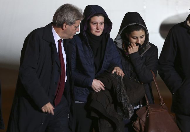 Στο αεροδρόμιο της Ρώμης υποδέχτηκε ο υπουργός Εξωτερικών της Ιταλίας Πάολο Τζεντιλόνι την 20χρονη Γκρέτα Ραμέλι και την 21χρονη Βανέσα Μαρζούλο, τις δύο Ιταλίδες που είχαν απαχθεί στη βόρεια Συρία και τελικά απελευθερώθηκαν.