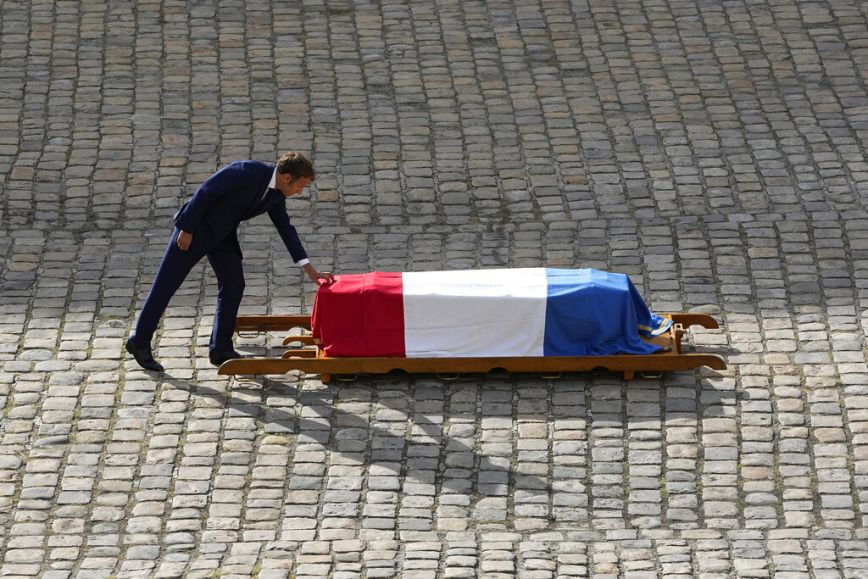 Οι νεκροπομποί μετέφεραν το φέρετρο του Ζαν-Πολ Μπελμοντό, καλυμμένο με τη γαλλική σημαία, στην αυλή του στρατιωτικού μουσείου των Απομάχων, όπου είναι θαμμένος ο Ναπολέοντας, για την επίσημη τελετή.