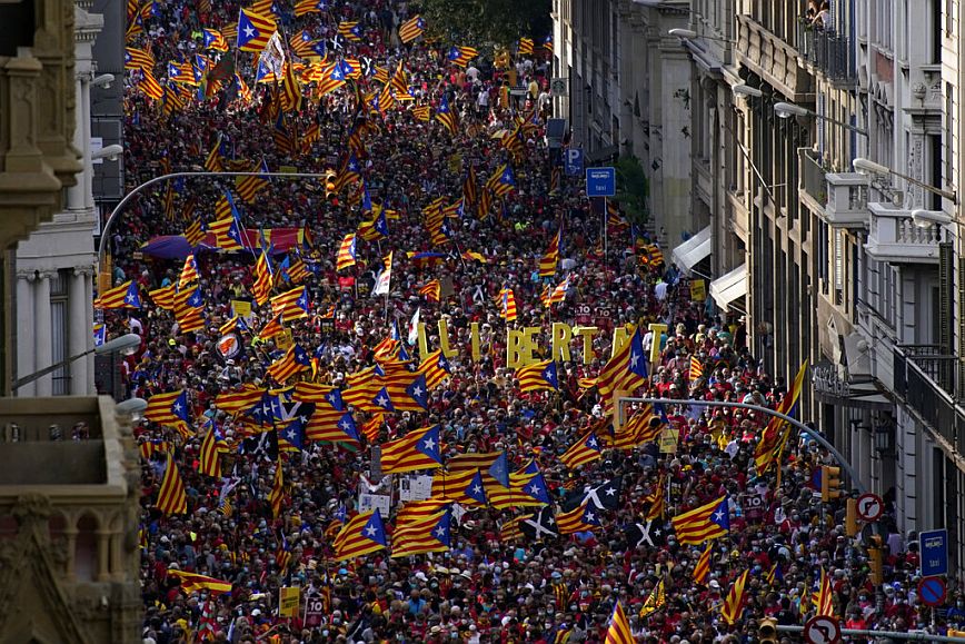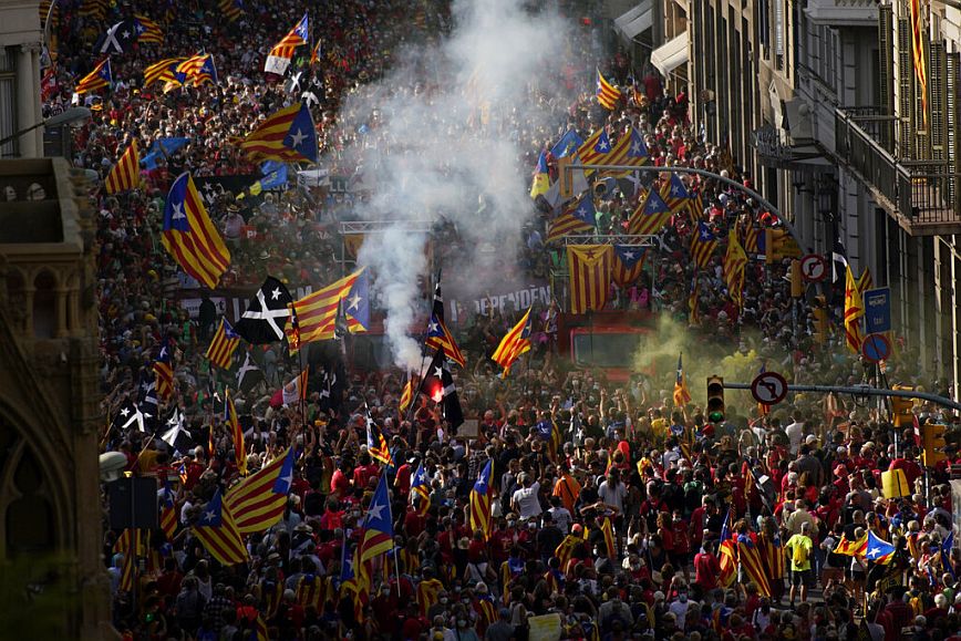 Χιλιάδες Καταλανοί, με τραγούδια και σημαίες, έκαναν πορεία το Σάββατο στη Βαρκελώνη, ζητώντας την ανεξαρτησία της περιοχής από την Ισπανία.