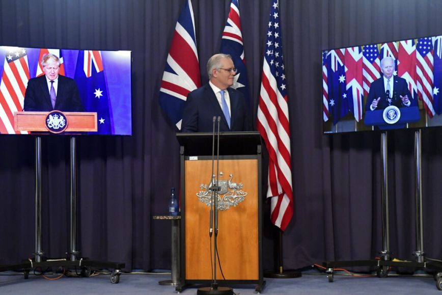«Η πρώτη μεγάλη πρωτοβουλία του “AUKUS” (σ.σ.: η ονομασία αυτού του νέου συμφώνου) θα είναι να παραδοθεί ένας στόλος υποβρυχίων πυρηνικής πρόωσης στην Αυστραλία», δήλωσαν ο αυστραλός πρωθυπουργός Σκοτ Μόρισον, εμφανιζόμενος μέσω βίντεο, όπως και ο βρετανός ομόλογός του Μπόρις Τζόνσον, στη διάρκεια εκδήλωσης υπό την προεδρία του Τζο Μπάιντεν στο Λευκό Οίκο.