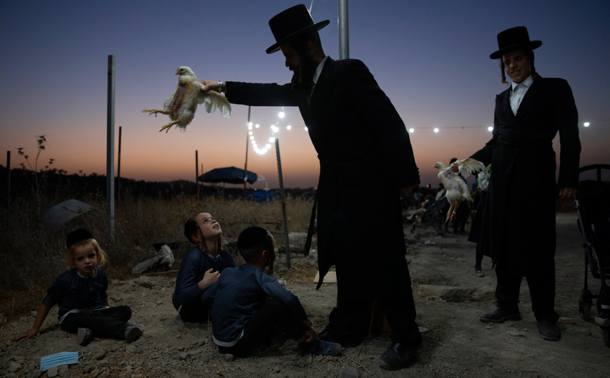 Ο υπερορθόδοξος Εβραίος κουνάει ένα κοτόπουλο πάνω από το κεφάλι ενός παιδιού με το τελετουργικό να θέλει κάθε αμαρτία του μικρού να φεύγει μέσω του σώματος του κοτόπουλου.