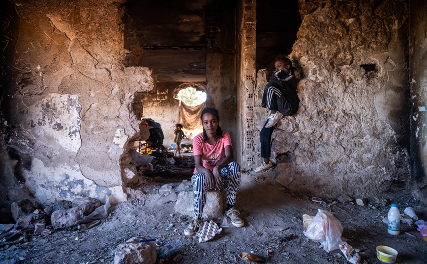 Κορίτσια από το Σουδάν κάθονται μέσα σε ένα εγκαταλελειμμένο φυλάκιο του στρατού κοντά στο χωριό Ιεροπηγή, στη βόρεια Ελλάδα, στα ελληνοαλβανικά σύνορα. Εκεί βρίσκεται ένα σχετικά ομαλό τμήμα των κακοτράχαλων συνόρων της Ελλάδας με την Αλβανία το οποίο έχει μετατραπεί στον κύριο διάδρομο για τους μετανάστες που ζητούν ένα καλύτερο αύριο προς την ευημερούσα καρδιά της Ευρώπης.
