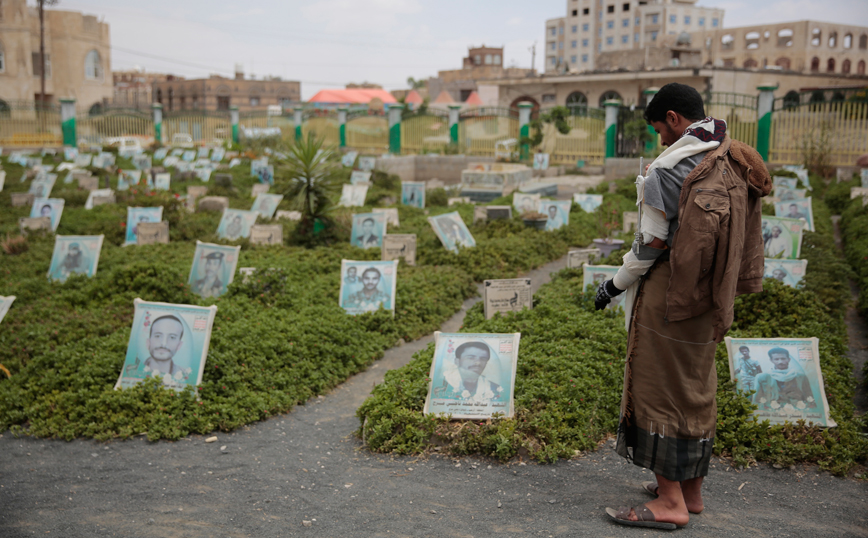 Ένας υποστηρικτής των Χούτι, τραυματίας πολέμου προσεύχεται στον τάφο συγγενών του, που σκοτώθηκαν κατά τη διάρκεια πρόσφατων συγκρούσεων, σε νεκροταφείο στη Σανά της Υεμένης.