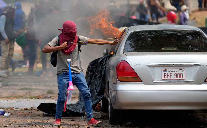Ένας διαδηλωτής χρησιμοποιεί μια σφεντόνα στις συγκρούσεις με την αστυνομία κατά τη διάρκεια διαμαρτυρίας των ιθαγενών εναντίον ενός προτεινόμενου νομοσχεδίου που ποινικοποιεί τις καταλήψεις γης, έξω από το Κογκρέσο της Παραγουάης