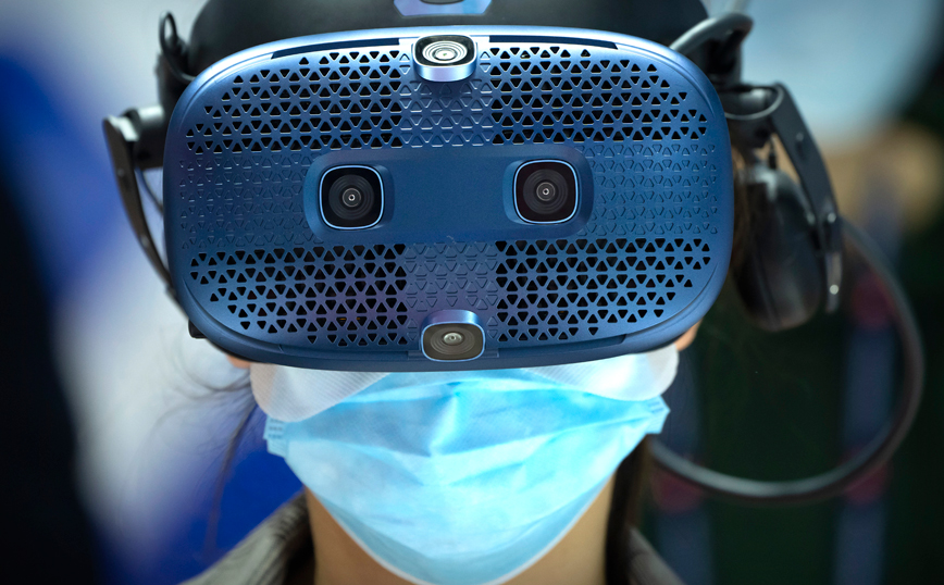Μια γυναίκα φοράει ένα σετ γυαλιών εικονικής πραγματικότητας ενώ κάνει μια προσομοιωμένη βόλτα με έλκηθρο σε ένα περίπτερο της κινεζικής εταιρείας τηλεπικοινωνιών China Unicom στο PT Expo στο Πεκίνο. Η ετήσια έκθεση παρουσιάζει κινεζικές και ξένες εταιρείες τηλεπικοινωνιών.