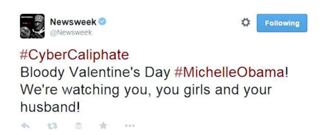 Ο λογαριασμός του αμερικανικού περιοδικού Newsweek στο Twitter μπήκε στο στόχαστρο χάκερς οι οποίοι ανήρτησαν απειλές εναντίον του προέδρου των ΗΠΑ, Μπαράκ Ομπάμα και της οικογένειάς του, καθώς και τις φράσεις «ΚυβερνοΧαλιφάτο» και «Είμαι ΙΚ», στα γαλλικά (Je suis IS), σε μια σαφή αναφορά στο Ισλαμικό Κράτος και το γαλλικό περιοδικό Σαρλί Εμπντό.