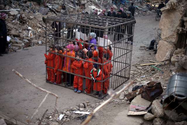 Στοιβαγμένα σε ένα παρόμοιο κλουβί, δεκάδες παιδιά φορούν τις πορτοκαλί φόρμες που φορούν τα θύματα των τζιχαντιστών. Μπροστά τους διακρίνεται ένας πυρσός με τις εικόνες θυμίζουν το σοκαριστικό βίντεο της εκτέλεσης του Lt Moaz al-Kasasbeh.