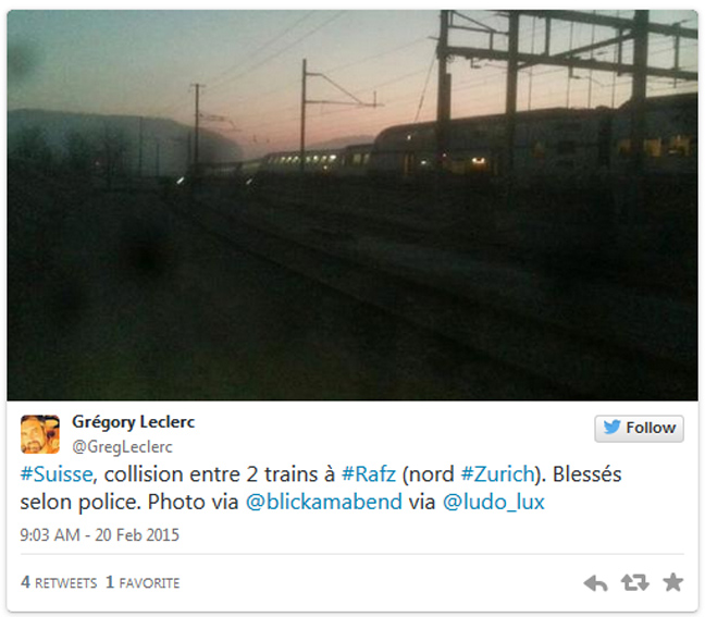 Δύο τρένα συγκρούστηκαν το πρωί στο Rafz, βόρεια της Ζυρίχης, ανακοίνωσε η αστυνομία του καντονίου.