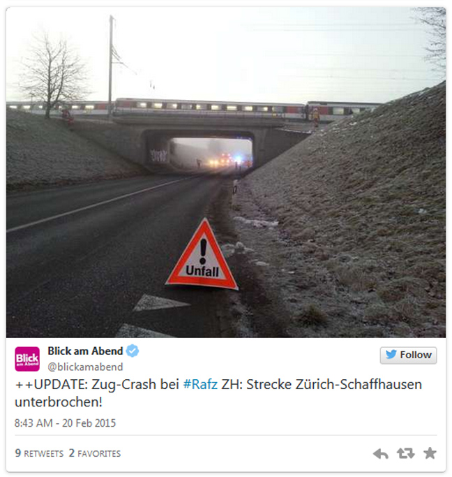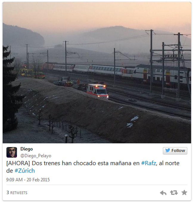 Σύμφωνα με τις πληροφορίες που δημοσιεύονται στις ενημερωτικές ιστοσελίδες, η σύγκρουση σημειώθηκε ανάμεσα σε τοπικό τρένο και σε συρμό του προαστιακού σιδηροδρόμου στην έξοδο του σταθμού του Rafz.