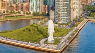 Ένα πανύψηλο άγαλμα ενός γυναικείου κεφαλιού με τον δείκτη να πιέζει τα χείλη βλέπει τώρα το Μανχάταν κατά μήκος του ποταμού Χάντσον, καλώντας τη χαοτική μητρόπολη να σταματήσει και να ακούσει.