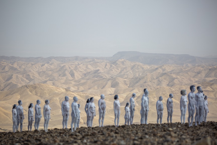 Περίπου 300 άντρες και γυναίκες εθελοντές γύμνωσαν τα κορμιά τους και… φορώντας μονάχα λευκή βαφή σώματος πόζαραν για τις ανάγκες του καινούργιου καλλιτεχνικού πρότζεκτ που είχε σκοπό να επιστήσει την προσοχή στη συρρίκνωση της Νεκράς Θάλασσας.