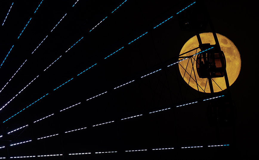 Όλοι οι άνθρωποι έχουν δικαίωμα στη διασκέδαση όσο ταλαιπωρημένοι και κουρασμένοι και αν είναι. Πολίτες στη Βαγδάτη απολαμβάνουν μια βόλτα σε ένα λούνα παρκ που απεικονίζεται με φόντο το φεγγάρι.