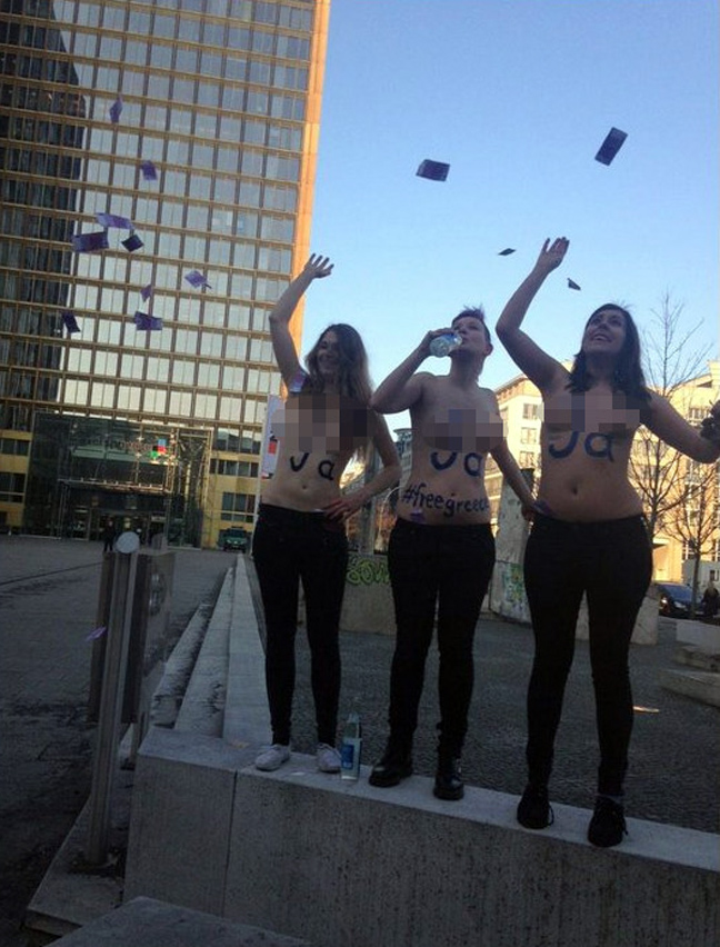 Ενώ εντός της γερμανικής βουλής βρισκόταν σε εξέλιξη η ψηφοφορία για την τετράμηνη επέκταση της δανειακής σύμβασης της Ελλάδας, τρεις γυμνόστηθες FEMEN, διαμαρτύρονταν με τον δικό τους πρωτότυπο τρόπο έξω από τα γραφεία της γερμανικής εφημερίδας Bild.