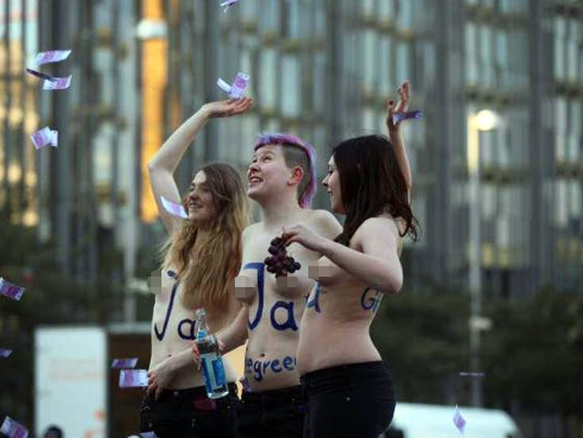 Με κρασί, ούζο, χορό και σταφύλια και πετώντας ψεύτικα χαρτονομίσματα των 500 ευρώ, οι τρεις νεαρές κοπέλες, εξέφρασαν την αλληλεγγύη τους προς την Ελλάδα. «Θέλουμε να δείξουμε ένα άλλο πρόσωπο. Όχι μόνον στους γερμανούς πολιτικούς αλλά και στον ελληνικό λαό», είπε η Γιοσεφίνε Βιτ, μια εκ των τριών ακτιβιστριών, που σημειωτέον σπουδάζει φιλοσοφία.