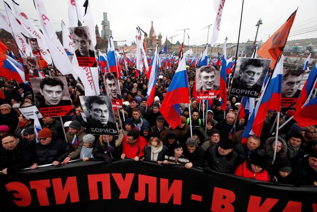 «Δεν φοβάμαι», «πέθανε για το μέλλον της Ρωσίας», «δολοφονήθηκε για μια ελεύθερη Ρωσία», «οι σφαίρες αυτές προορίζονται για τον καθένα εξ ημών» ήταν μερικά από τα συνθήματα που έγραφαν τα πανό και τα πλακάτ των διαδηλωτών, πολλοί εκ των οποίων κρατούσαν στα χέρια τους μία σημαία της Ρωσίας,.