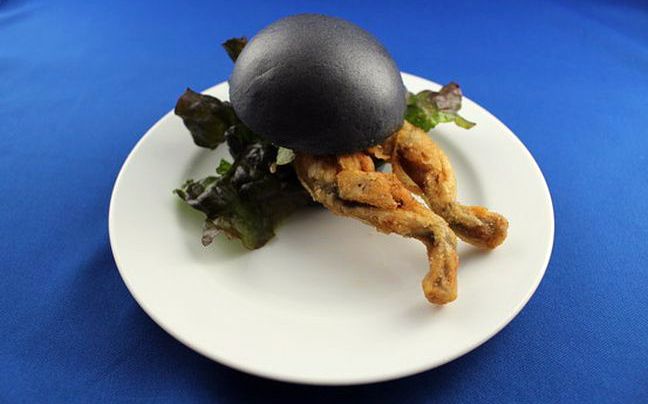 Τα ψωμάκια είναι μαύρα και για γέμιση έχει τηγανητά βατραχοπόδαρα. Το συγκεκριμένο πιάτο είναι προσφέρεται από το μουσείο Orbi Yokohama στην Ιαπωνία. Αλλά πρέπει να σπεύσετε για να το γευτείτε, διότι διατίθεται σε περιορισμένο αριθμό. Το συγκεκριμένο πιάτο, «φιλοτεχνήθηκε» για τον εορτασμό της έκθεσης Deadly Poison και κοστίζει περί τα 1.000 γιεν. (περίπου 8 ευρώ).