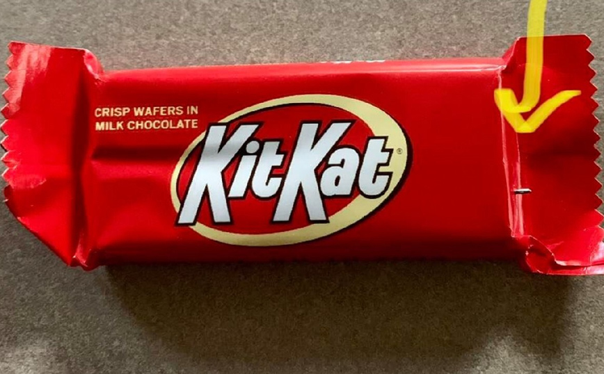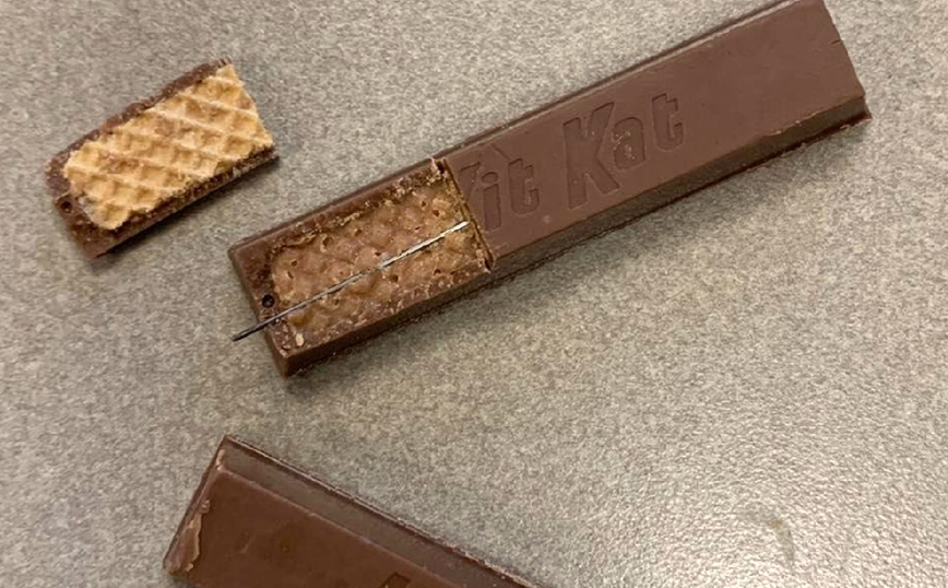 Οι φωτογραφίες που έδωσε στη δημοσιότητα το αστυνομικό τμήμα έδειχναν ένα από τα γλυκά, μια μπάρα Kit Kat, με μια βελόνα να βγαίνει από τη μία άκρη του περιτυλίγματος.