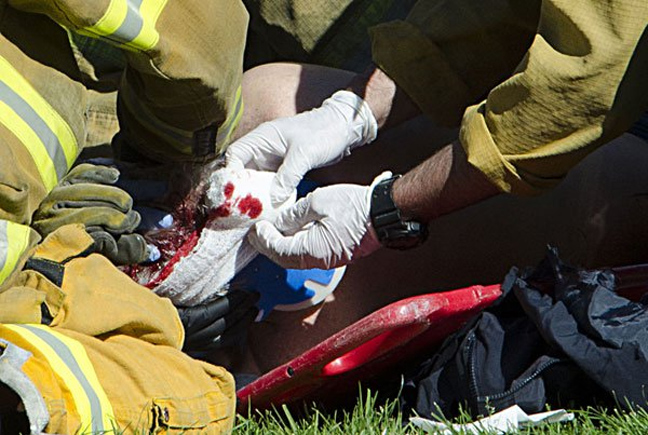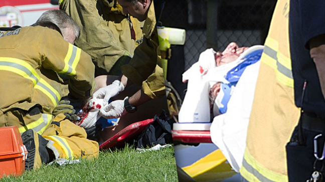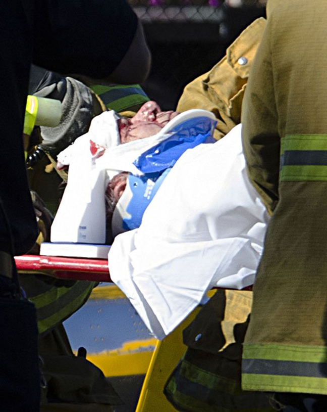 Στις φωτογραφίες, ο 72χρονος χολιγουντιανός σταρ με εμφανή τα σημάδια από τον τραυματισμό του, βρίσκεται στο φορείο με το κολάρο, ενώ οι νοσηλευτές του παρέχουν τις πρώτες βοήθειες.