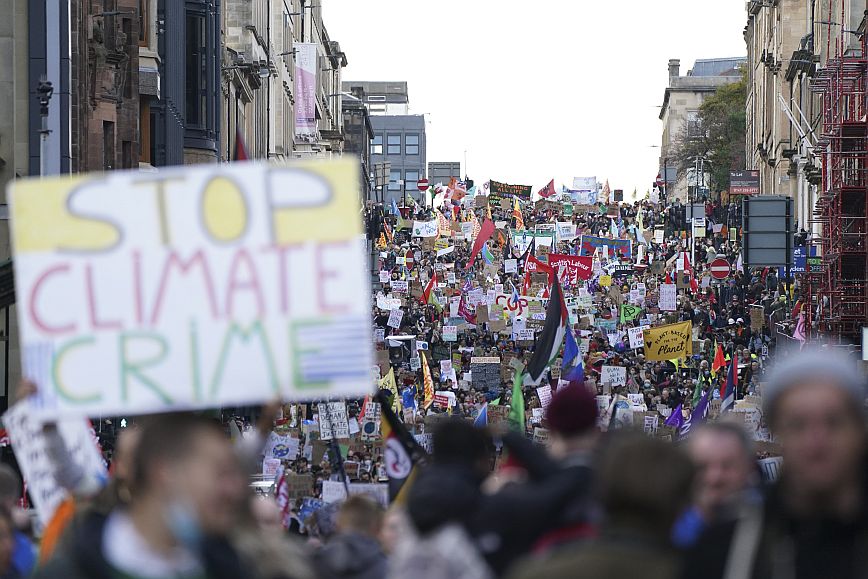 «Αυτό είναι το μέλλον μας»: δεκάδες χιλιάδες διαδηλωτές για το κλίμα αψήφησαν το Σάββατο την καταρρακτώδη βροχή και τις ριπές ανέμου στη Γλασκώβη επίκεντρο μιας παγκόσμιας κινητοποίησης, για να απαιτήσουν από τους ηγέτες να αναλάβουν δράση για την κλιματική αλλαγή που απειλεί την ανθρωπότητα.