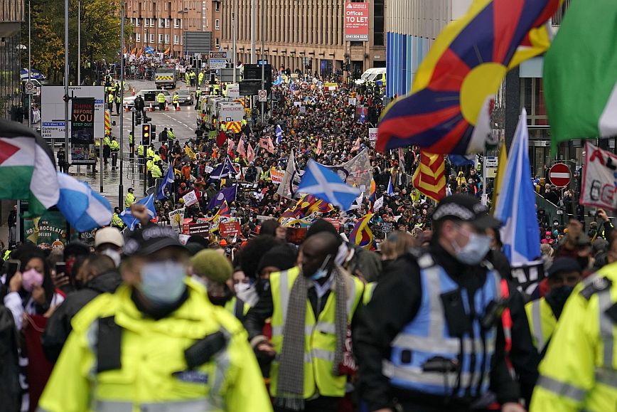 Υπό τον ήχο της γκάιντας και των τυμπάνων, η πολύχρωμη πομπή σείστηκε νωρίς το απόγευμα, κοντά στο συνεδριακό κέντρο, όπου εφαρμόζονται αυστηρά μέτρα ασφαλείας καθώς εκεί διεξάγεται εδώ και μια εβδομάδα η μεγάλη διάσκεψη COP26 του ΟΗΕ για το κλίμα, που θεωρείται κεφαλαιώδης για το μέλλον της ανθρωπότητας.