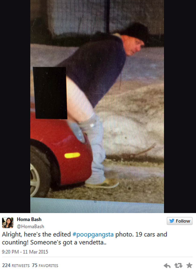 Χθες, πάντως ένας γείτονας κατάφερε και κατέγραψε τον ασυγκράτητο αυτό τύπο, χάρη σε μια κάμερα που είχε τοποθετήσει έξω από το σπίτι του. Στο καρέ που κατέγραψε, ο ύποπτος είναι με κατεβασμένα τα παντελόνια, έτοιμος να πράξει αυτό που ξέρει καλύτερα-η φωτογραφία φυσικά κατέληξε στα χέρια των αστυνομικών που πλέον τον αναζητούν.