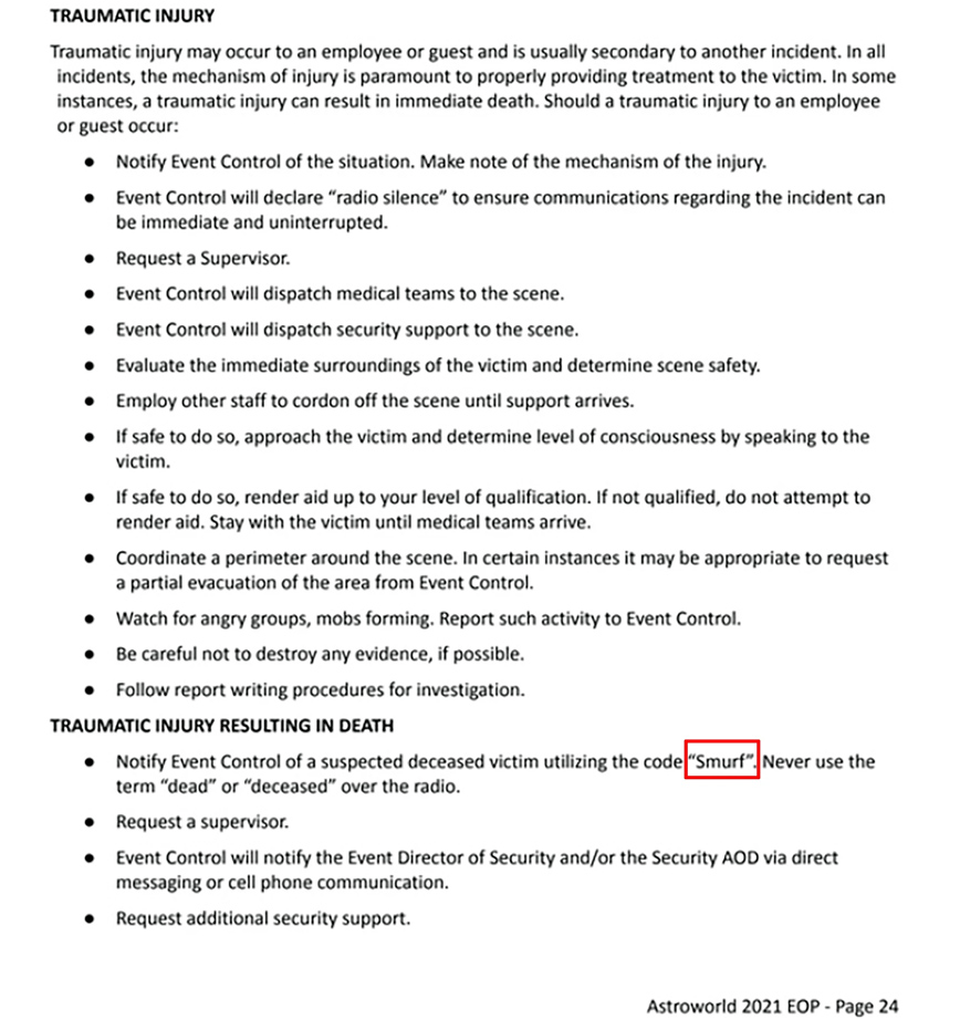 Το Σχέδιο Επιχειρήσεων Εκδηλώσεων 56 σελίδων, το οποίο ελήφθη από το CNN, δίνει οδηγίες στο προσωπικό του NRG Park στο Χιούστον να μην χρησιμοποιούν ποτέ τους όρους «νεκρός» ή «αποθανών» στους ασυρμάτους.