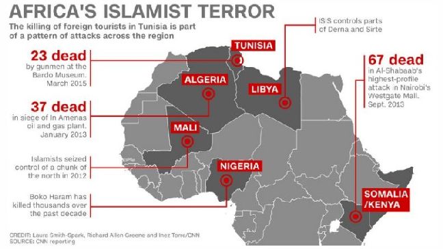 Στο παρακάτω γράφημα απεικονίζεται η εξάπλωση του «ισλαμικού τρόμου» στην Αφρική και οι αριθμοί των νεκρών από επιθέσεις σε διάφορες χώρες της «μαύρης ηπείρου».