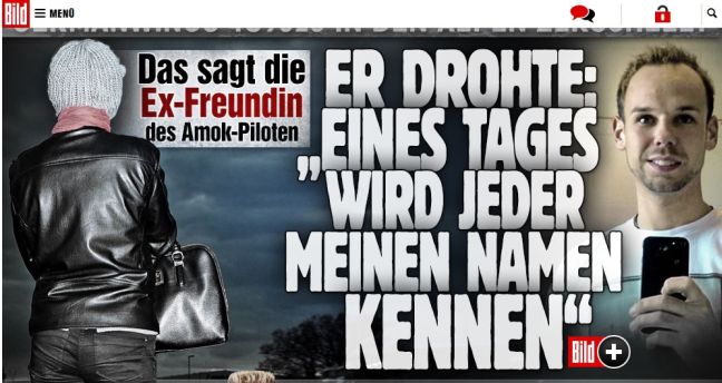 Ο Αντρέας Λούμπιτς, ο συγκυβερνήτης που σκόπιμα προκάλεσε τη συντριβή του Airbus A320 της Germanwings στις γαλλικές Άλπεις σκοτώνοντας 149 άτομα, μάλλον ήξερε ότι κάποια στιγμή το όνομά του θα έμενε στη ιστορία, όπως αποκαλύπτει σημερινό δημοσίευμα της εφημερίδας Bild.