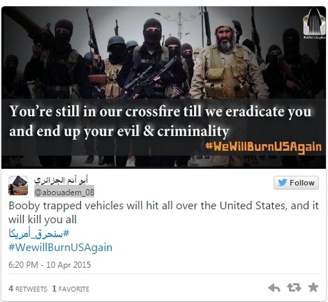 Συγκεκριμένα, σε μία από τις εκατοντάδες προπαγανδιστικές του εκστρατείες το Ισλαμικό Κράτος με hashtag #WeWillBurnUSAgain απειλεί ότι θα εξαπολύσει νέο γύρο τρομοκρατικών χτυπημάτων στην καρδιά των ΗΠΑ, υπενθυμίζοντας το τρομοκρατικό χτύπημα στους Δίδυμους Πύργους της 11ης Σεπτεμβρίου.