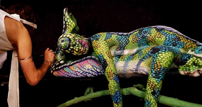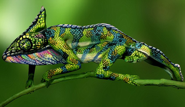 Ένας χαμαιλέοντας ισορροπεί προσεκτικά πάνω σε ένα κλαδί, περιμένοντας υπομονετικά τη λεία του… Ή μάλλον όχι! Αν κοιτάξετε προσεκτικά την εικόνα, θα δείτε ότι δεν είναι αυτό που φαίνεται. Γιατί στην πραγματικότητα, πρόκειται για δυο γυναίκες, η μια πάνω στην άλλη, οι οποίες χάρη στη ζωγραφική σώματος, μοιάζουν τρομακτικά με μια πολύχρωμη σαύρα!
