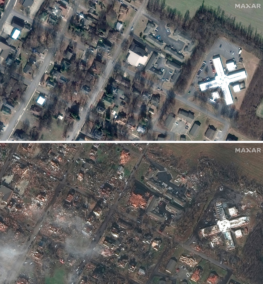 Οι δορυφορικές εικόνες που τραβήχτηκαν μετά το πέρασμα των ανεμοστρόβιλων δείχνουν κτίρια εντελώς ισοπεδωμένα στο Μέιφιλντ, μια πόλη περίπου 10.000 κατοίκων στο δυτικό Κεντάκι.