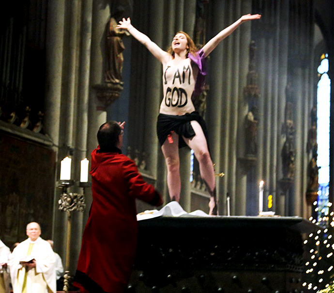 Η χαρακτηριστικότερη ήταν τα Χριστούγεννα του 2013, όταν εισέβαλε σε έναν καθεδρικό ναό στην Κολωνία, φορώντας μόνο ένα σουτιέν, ενώ πάνω στο στήθος της έγραφε «εγώ είμαι ο Θεός».