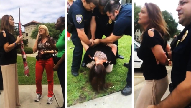 Οι διαδηλωτές στο Valdosta State University στην Τζόρτζια των ΗΠΑ, στην πλειοψηφία τους αφροαμερικανοί, άρχισαν να καταστρέφουν τη σημία όταν επενέβη η Michelle Manhart.