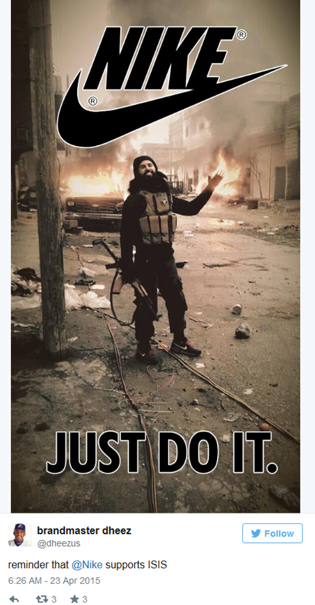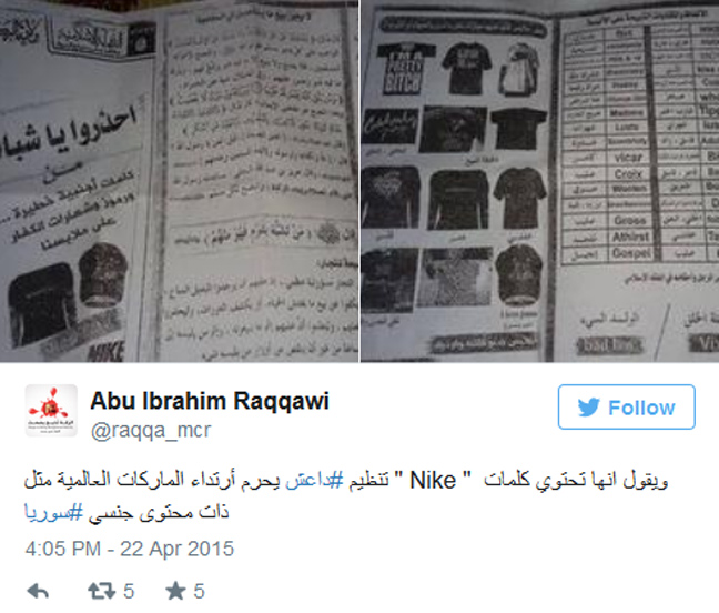 Το Ισλαμικό Κράτος (IS, πρώην ISIS) εδρεύει στη Raqqa και όπως γράφει ρεπορτάζ του Russia Today, εξέδωσαν ένα φυλλάδιο προειδοποιώντας τους τζιχαντιστές να ταχθούν κατά της χρήση οποιουδήποτε προϊόντος της Nike. Οι ποινές τόσο για τους πωλητές όσο και για τους αγοραστές προϊόντων της γνωστής εταιρείας, ποικίλουν: από ένα μικρό πρόστιμο, μέχρι φυλάκιση ή μαστίγωμα.