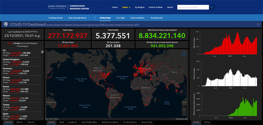 Σύμφωνα με τα στοιχεία του Πανεπιστημίου Johns Hopkins οι χώρες που βρίσκονται στην πεντάδα με τους περισσότερους νεκρους είναι: οι ΗΠΑ (812.069), το Ηνωμένο Βασίλειο (148.038), η Γερμανία (109.753), η Γαλλία (123.101) και η Ρωσία (294.322).