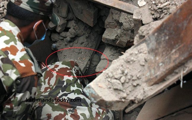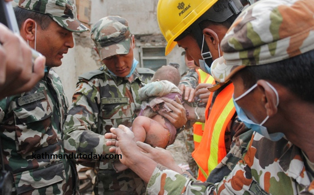 Το αγοράκι ήταν από τους τυχερούς, το όνομά του δεν θα μπει στη λίστα των θυμάτων. Έμεινε 22 ώρες μέσα στο γκρεμισμένο σπίτι και αρχικά τα σωστικά συνεργεία και οι άνδρες του στρατού του Νεπάλ δεν κατάφεραν να το απεγκλωβίσουν και θεώρησαν πως είναι νεκρό. Λίγες ώρες αργότερα όμως οι φωνές του τους έκαναν να καταλάβουν πως η θέληση για ζωή- και η τύχη- είναι πιο δυνατές από τα Ρίχτερ. Επέστρεψαν στα συντρίμμια και με τιτάνια μάχη κατάφεραν να βγάλουν το 4 μηνών αγοράκι έξω.