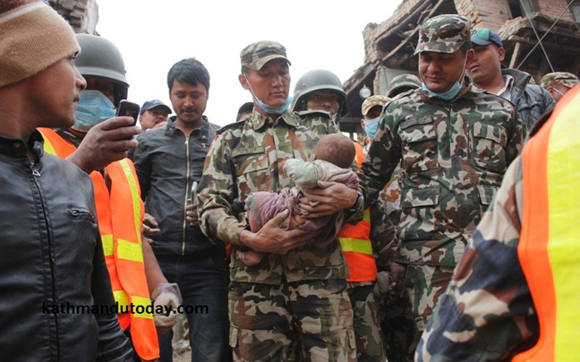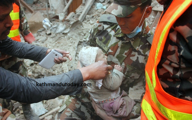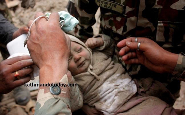 Για τουλάχιστον 22 ώρες το βρέφος της φωτογραφίας έμεινε παγιδευμένο κάτω από τα συντρίμμια σπιτιού που κατέρρευσε μετά τον πολύ ισχυρό σεισμό των 7,9 Ρίχτερ που έπληξε το Σάββατο στο Νεπάλ ισοπεδώνοντας πολλές περιοχές της χώρας και σκοτώνοντας τουλάχιστον 4.800 ανθρώπους.