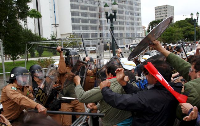 Όπως φαίνεται σε βίντεο που αναρτήθηκαν στον ιστότοπο της εφημερίδας Gazeta do Povo, αστυνομικοί εκτοξεύουν δακρυγόνα εναντίον πλήθους διαδηλωτών που πλησίαζαν το κοινοβούλιο της πολιτείας Παρανά, όπου διεξαγόταν ψηφοφορία επί ενός σχεδίου νόμου που μεταβάλλει τους όρους συνταξιοδότησης για τους δασκάλους.