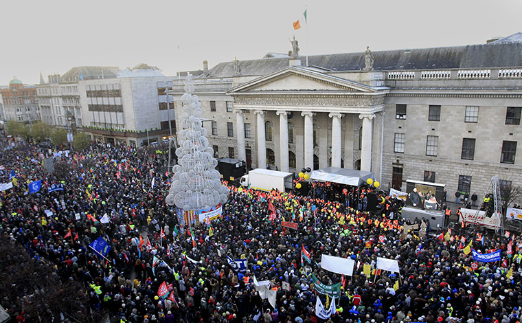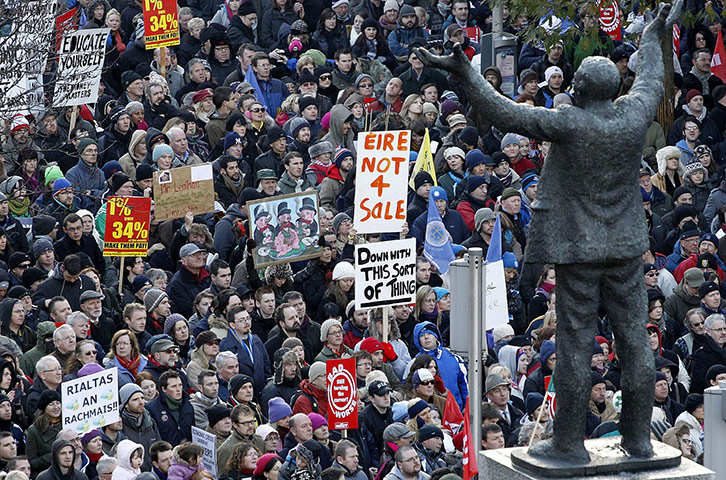 Παρά το τσουχτερό κρύο, πολύ μεγάλη συμμετοχή είχε η σημερινή διαδήλωση στο κέντρο του Δουβλίνου καθώς, σύμφωνα με νεότερα στοιχεία, υπολογίζεται ότι μεταξύ 50.000 και 150.000 άτομα διαδήλωσαν κατά του προγράμματος λιτότητας της κυβέρνησης της Ιρλανδίας.
