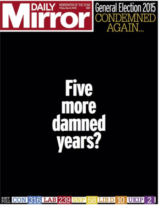Η εφημερίδα η οποία κατά την διάρκεια της προεκλογικής περιόδου στήριζε τους Εργατικούς, στο άκουσμα των αποτελεσμάτων που προβλέπουν τα έξιτ πολς ετοίμασε το πρωτοσέλιδό της. «Άλλα πέντε καταραμένα χρόνια;», αναρωτιέται η Mirror, με μία πρώτη σελίδα ολόμαυρη στο κάτω μέρος της οποίας περιλαμβάνονται οι σχετικές προβλέψεις.