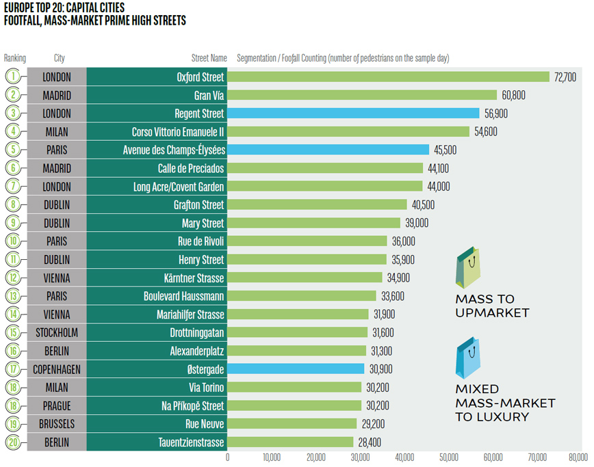Σύμφωνα, λοιπόν, με την έκθεση, ο πιο δημοφιλής εμπορικός δρόμος στην Ευρώπη είναι η οδός Όξφορντ (Oxford Street) του Λονδίνου. Η Oxford Street κατέλαβε την πρώτη θέση με 72.700 επισκέπτες, ξεπερνώντας την Γκραν Βία (Gran Via) της Μαδρίτης κατά περίπου 12.000 επισκέπτες την ημέρα, με ημερήσιο ρυθμό 60.800 επισκεπτών, ενώ η Κόρσο Βιτόριο Εμανουέλε ΙΙ (Corso Vittorio Emanuele II) στο Μιλάνο συγκεντρώνει 54.600 επισκέπτες και η Λεωφόρος των Ηλυσίων Πεδίων (Champs-Elysées) στο Παρίσι είναι στην πέμπτη θέση με 45.500 επισκέπτες.