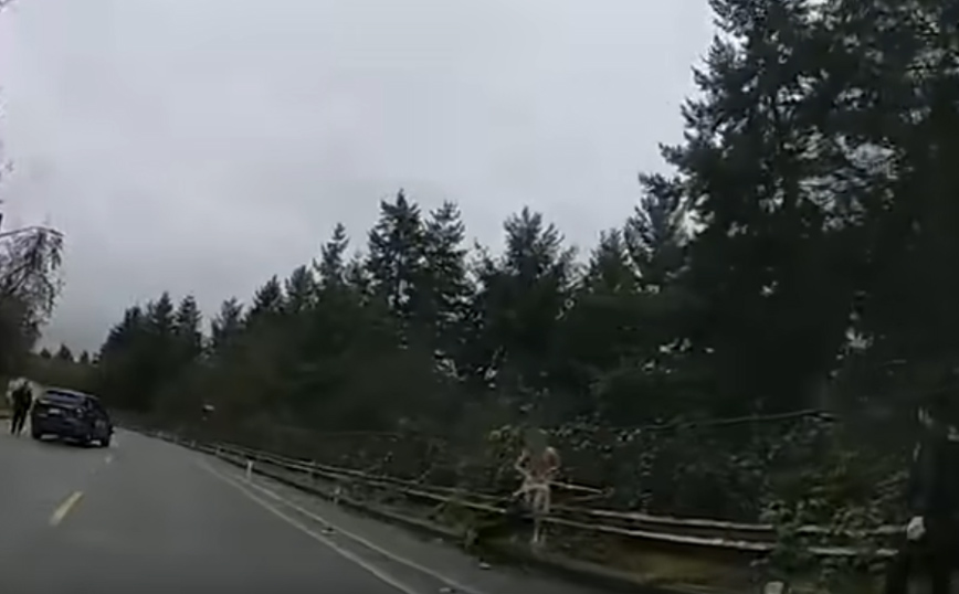 Στο βίντεο που δημοσίευσε η αστυνομία φαίνεται ένα περιπολικό να φτάνει στο σημείο με τον αστυνομικό να λέει: «Κάτι συμβαίνει εδώ. Μπορεί να είναι ο τύπος… Κάποιου είδους πετσέτα πάνω του. Κάποιος τον κυνηγά με ένα μπαστούνι του μπέιζμπολ».